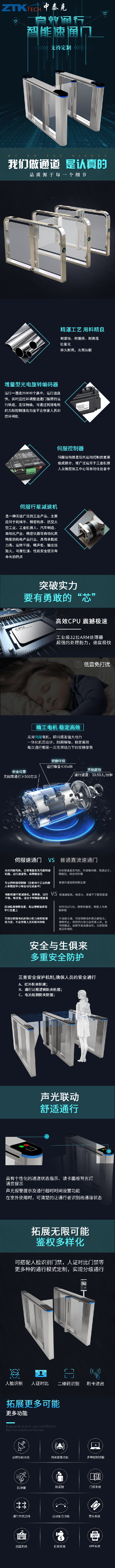 ZTK830S8智能速通门是经过多年精心开发、研制、生产的智能化通道管理设备,是主要针对人员通道进行智能管理的高科技产品。该设备将机械、电子、微处理器控制及各种身份识别技术有机地融为一体,通过选配各种身份识别系统设备和采用性能可靠的安全保护装置、报警装置、方向指示、以及扩展友好的LED计数显示界面,协调实现对通道智能化控制与管理等。 智能摆闸能方便兼容IC卡、ID卡、条码卡、指纹等读卡识别设备的使用,为出入人员提供文明、有序的通行方式,有效管理人员进出。可广泛应用于车站、码头、地铁、工厂、大厦、智能小区、宾馆、会所、企事业单位等需要对通道实现智能化管理的场合。